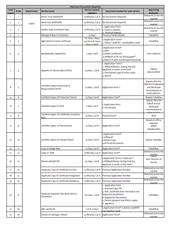 AP Meeseva Documents Required For All Application Forms PDF